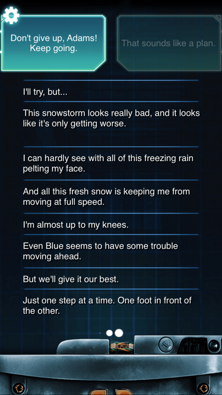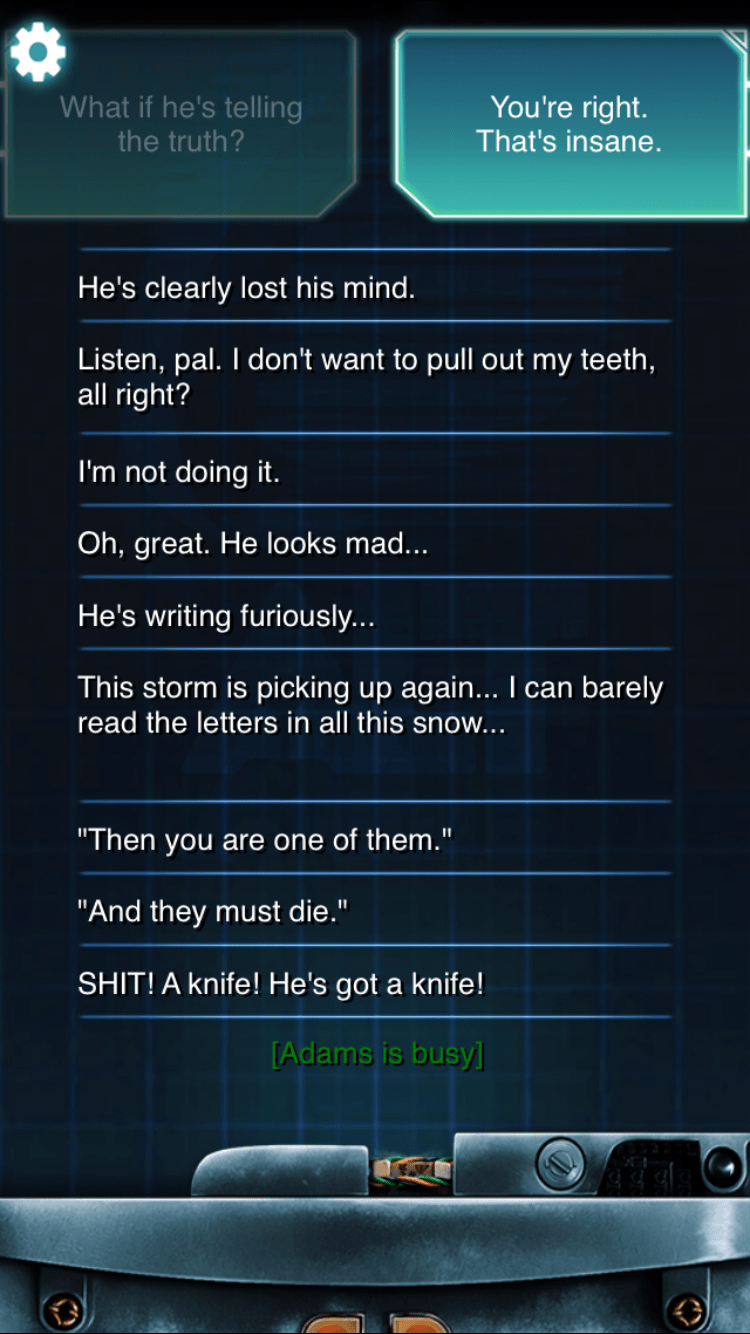 The Lifeline series is well-known for its realistic immersion – as players are treated to text messages sent in “real-time” to their mobile devices from the main character. Messages are presented as “speech-to-text” so players are reading what the character is speaking to them, allowing for more casual conversation. The main character of Whiteout, Adams, can be “away” for as short as 30 seconds or as long as several hours if he’s going to sleep for the night, for example.